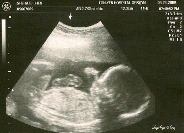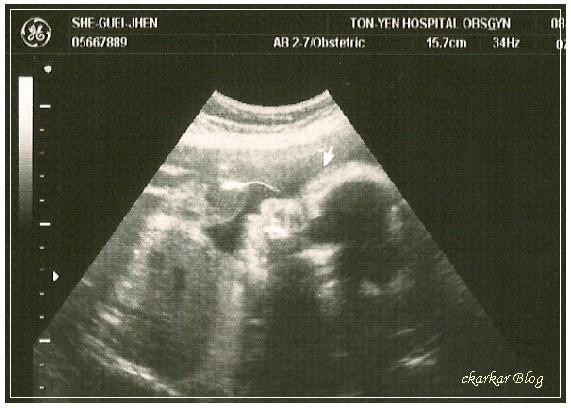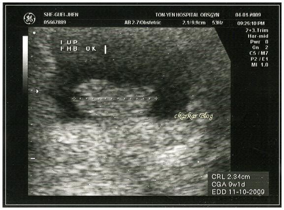 這是4/1產檢時的超音波照片,9w1d、2.34cm 已經有心跳,在醫院等待的時間很長,最後的結果很令人開心!!